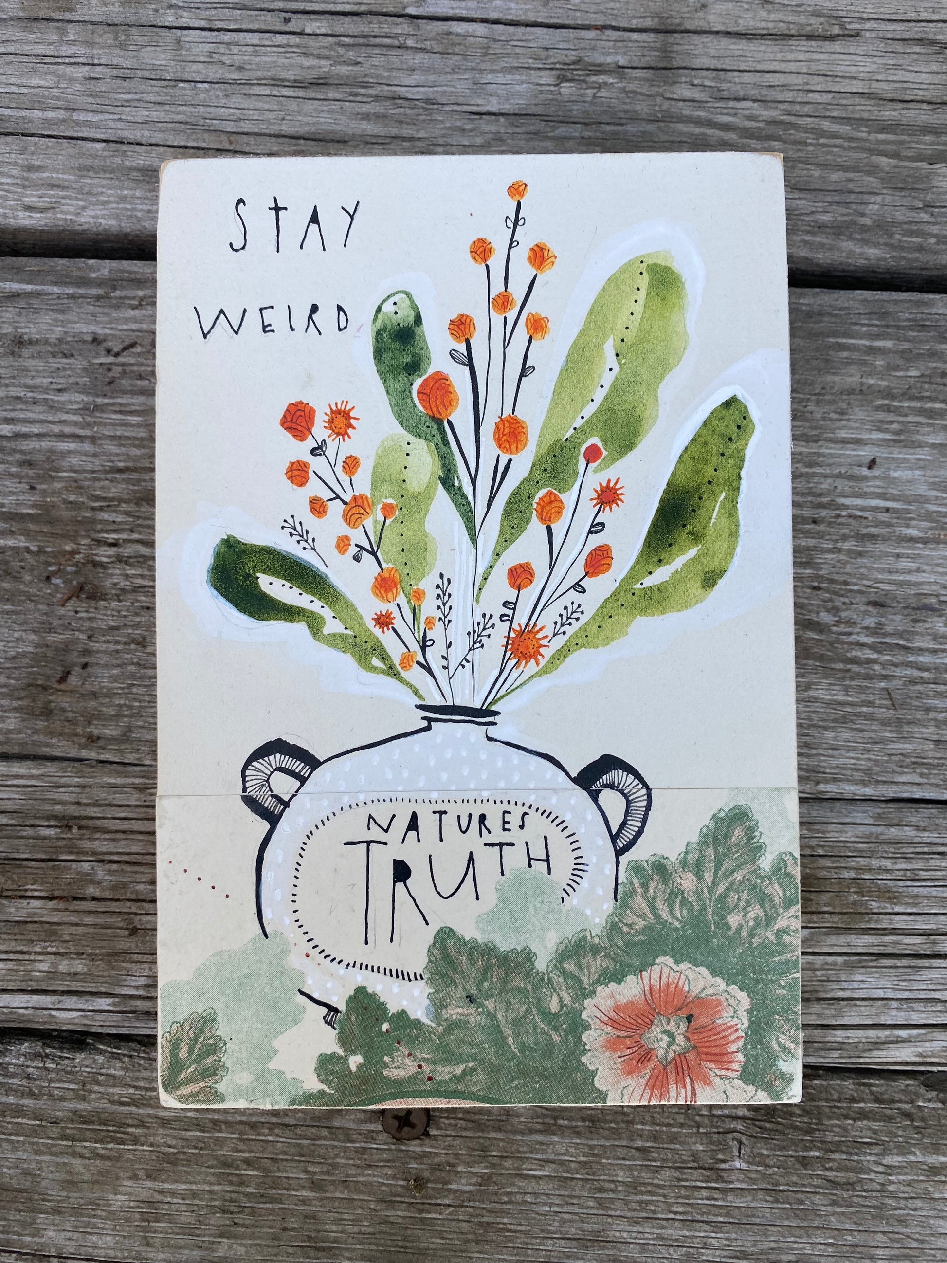 Discover this one-of-a-kind beauty, titled Stay Weird. A mixed media original painting by Cori Dantini. Vibrant orange flowers and lush green leaves fill the whimsical vase. This piece is a celebration of “nature's truth”, which is… stay weird!!!. Embrace your uniqueness with this whimsical and thought-provoking painting.
